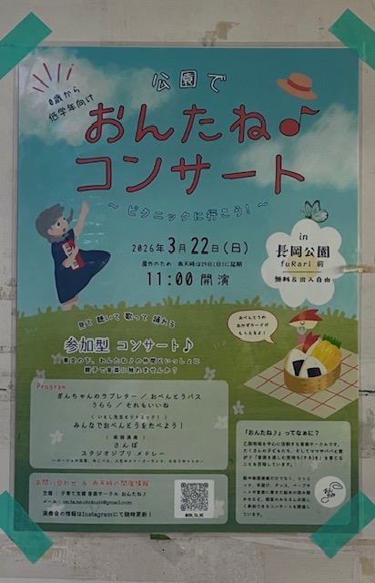ホーム > 営業 依田 > おんたね♪コンサート 2026/02/27 こんにちは。 来月3月22日に長岡公園にて小さいお子様向けのコンサートが開催されます。 楽器の音に触れ合う機会は意外と少ない気がします。 実際の楽器から聞こえる音は、テレビなどから聞こえる音とはまた違った聞こえ方をするのではないかと思います。 無料で楽しめますので、お子様がいるご家庭の方は是非参加してみてください。 B! LINEへ送る - 営業 依田